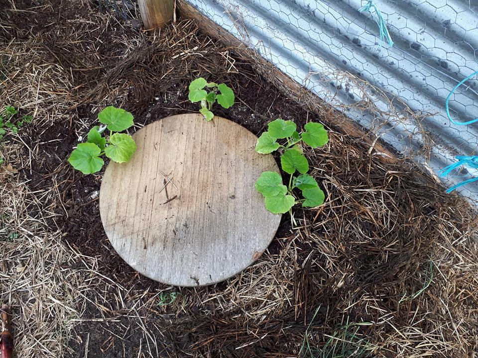 The ollas are working really, really well so far - have had some really warm days and the soil stays moist. When they get a bit bigger and can survive the bugs I'll mulch these pumpkins, and all my other seedlings, properly.