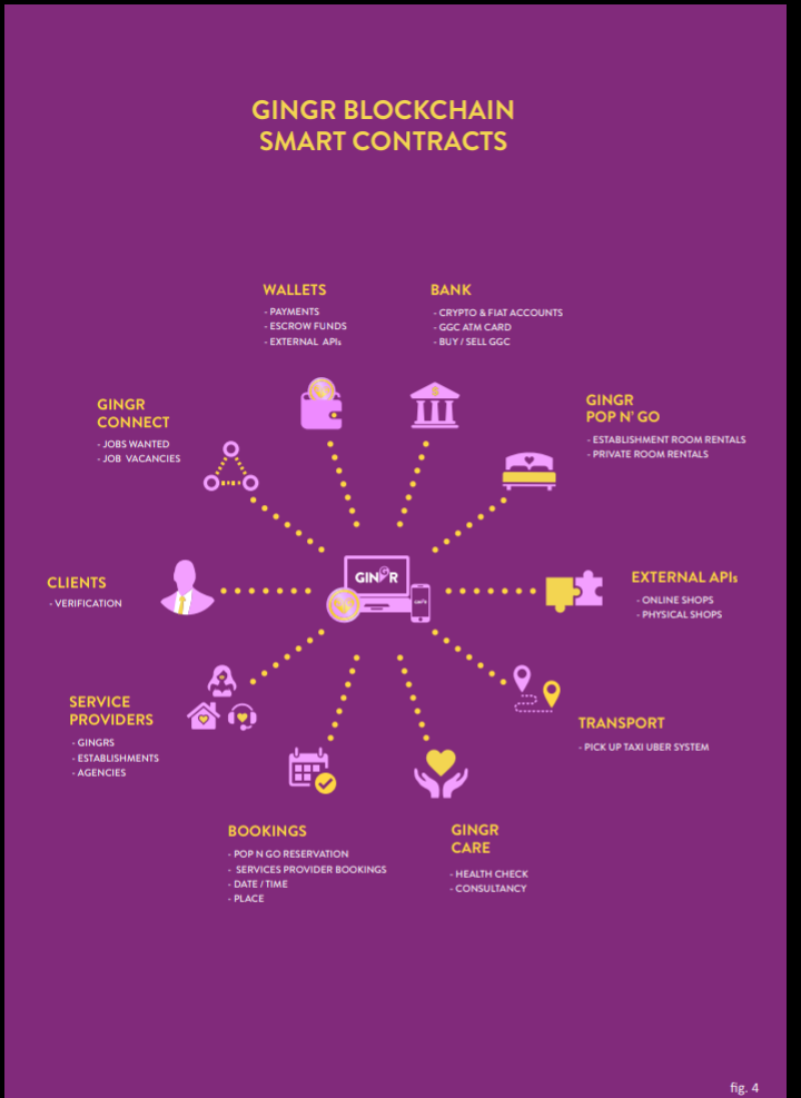 Gingr seeks to implement the modernization of the prostitution industry by creating an easy means to book for sexual services, Gingr seeks to create the first end-to-end booking platform for prostitution using blockchain technology. This allows prostitutes and sex-workers an effective means to reach more clients and make more money by advertising themselves on the Gingr platform. Gingr Platform was created with the participants of the ecosystem in mind, a safe place for all sex-workers to operate in a safe environment, free from all illegitimacy of the former system.