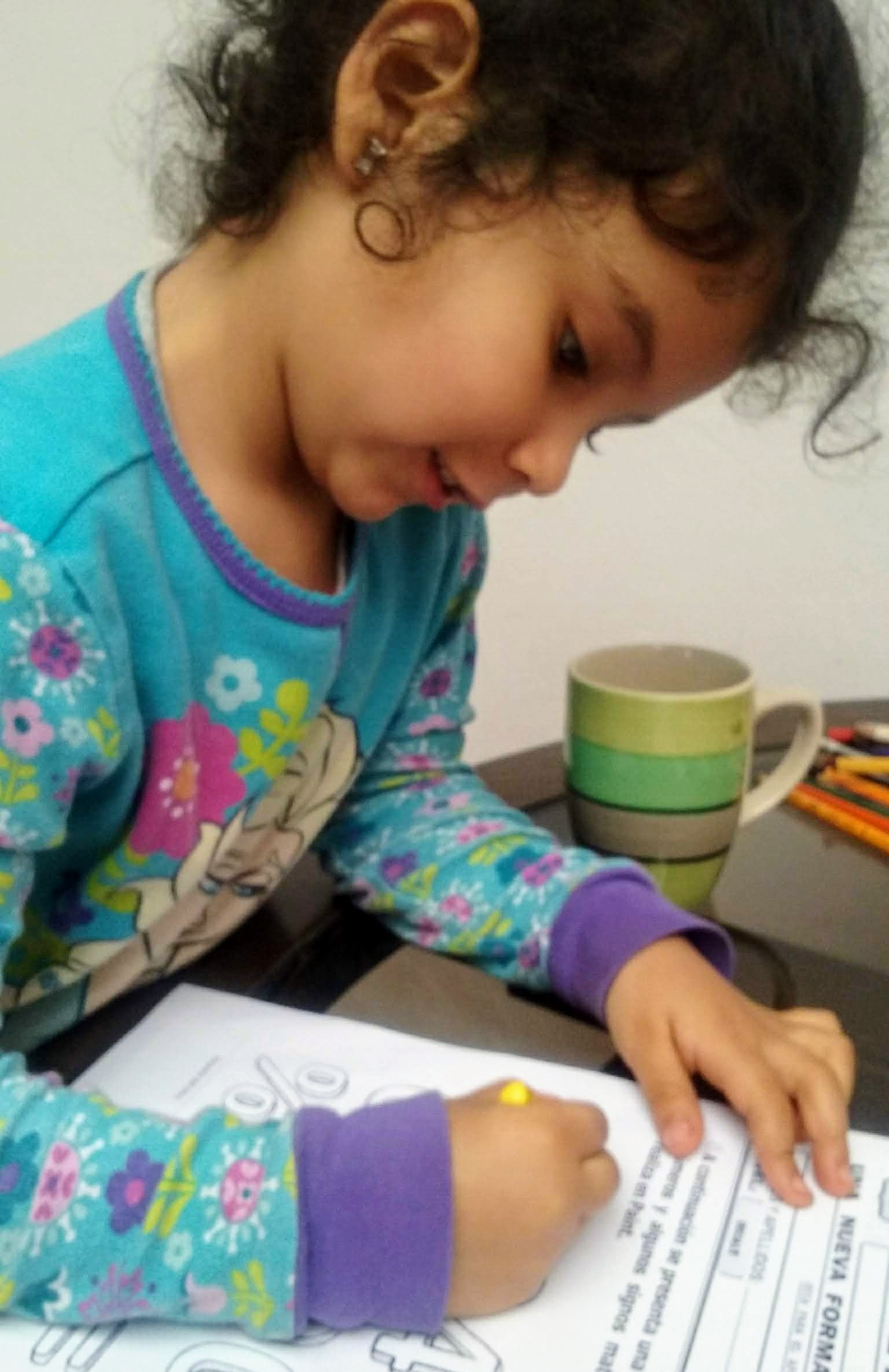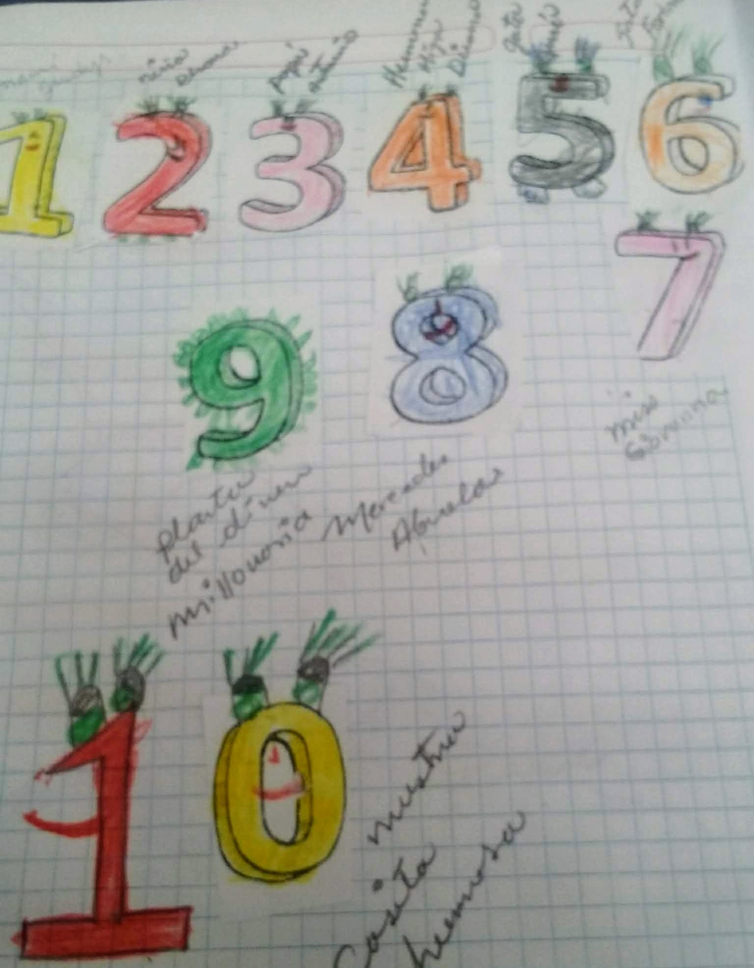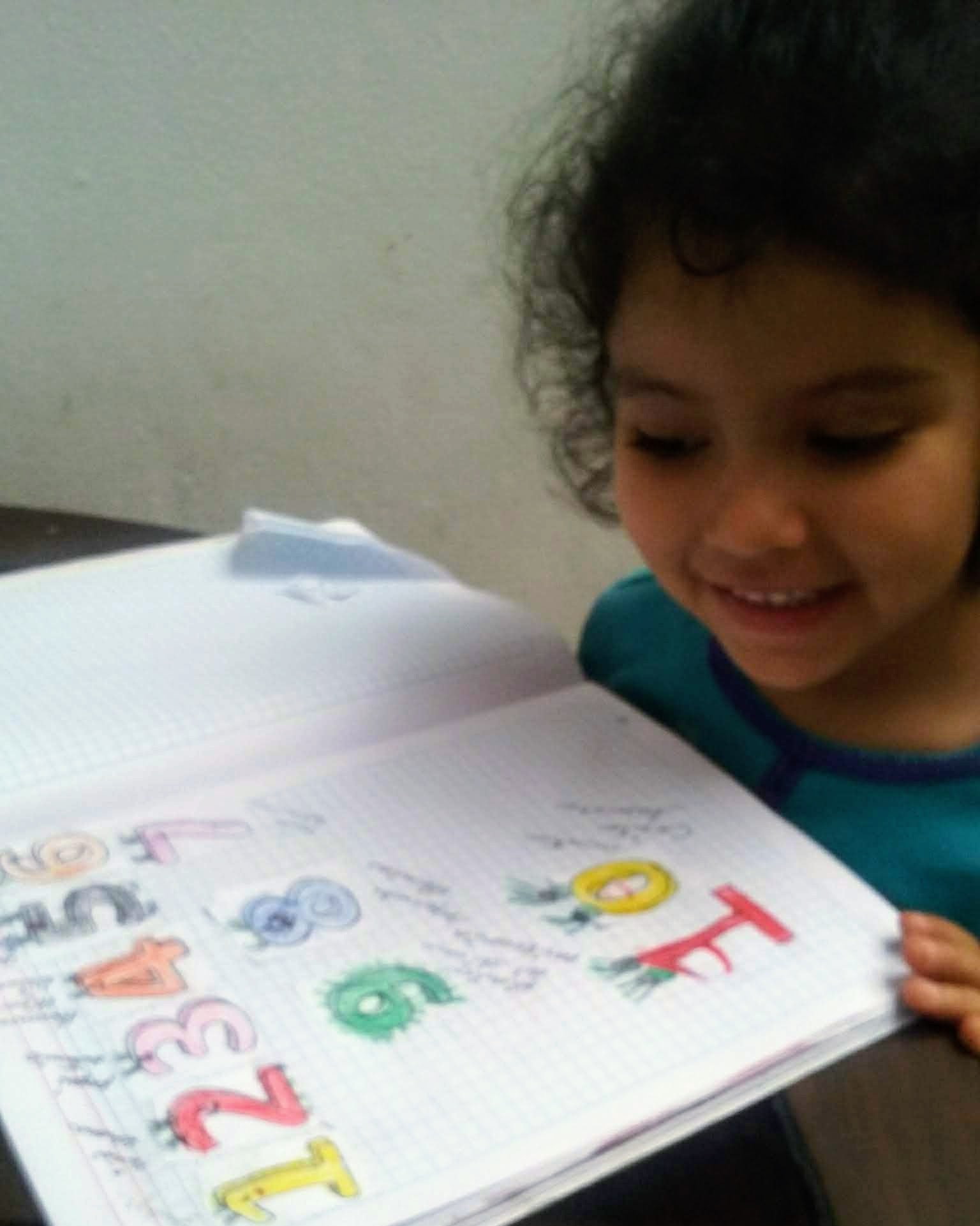 beautiful girl performs activity of the schoolboy and learns the numbers in an interactive and meaningful way ..explico: the girl associates the numbers with a family member and a color..that way the girl learns significantly .. the numbers and colors..