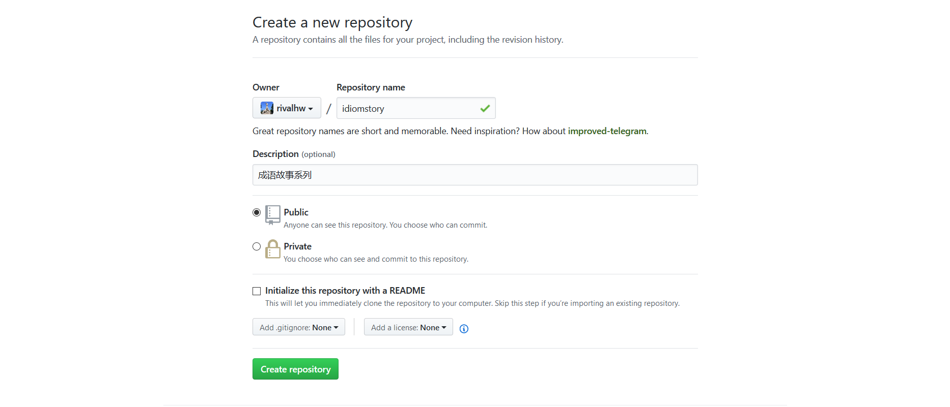 输入项目的名称,填写描述信息等,默认选择公开public ,当然你也可以选择私密private ,选中下边的初始化,然后点击最下边绿色按钮,开始创建。