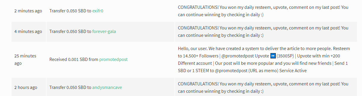 For all my posts, I collect the resteems, comments, and upvotes made on my posts the last week and use a https://snackaholic.github.io/steemfortune/en/ by @snackaholic to determine the 3 winners who receive 0.5 SBD each and announce it on the next post! I also send out 0.001 monthly to my followers with a small bulletin update. By following me you opt-in to receiving it!