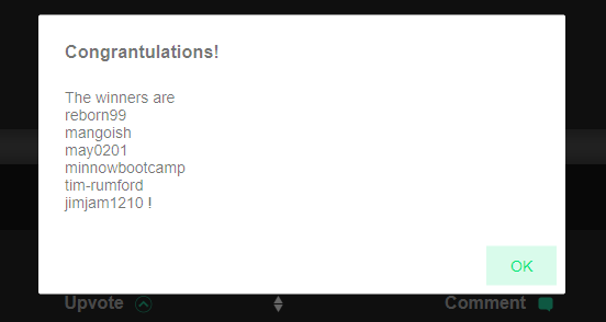 Congratulations to @reborn99 @mangoish @may0201 @minnowbootcamp @tim-rumford @jimjam1210