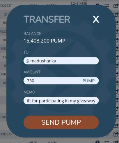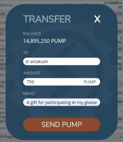 550 Pumpcoins to you plus an extra bonus of 200 for the upvotes. Follow me on steemit too and expect more giveaways from me. On my blog post everyone is a winner.