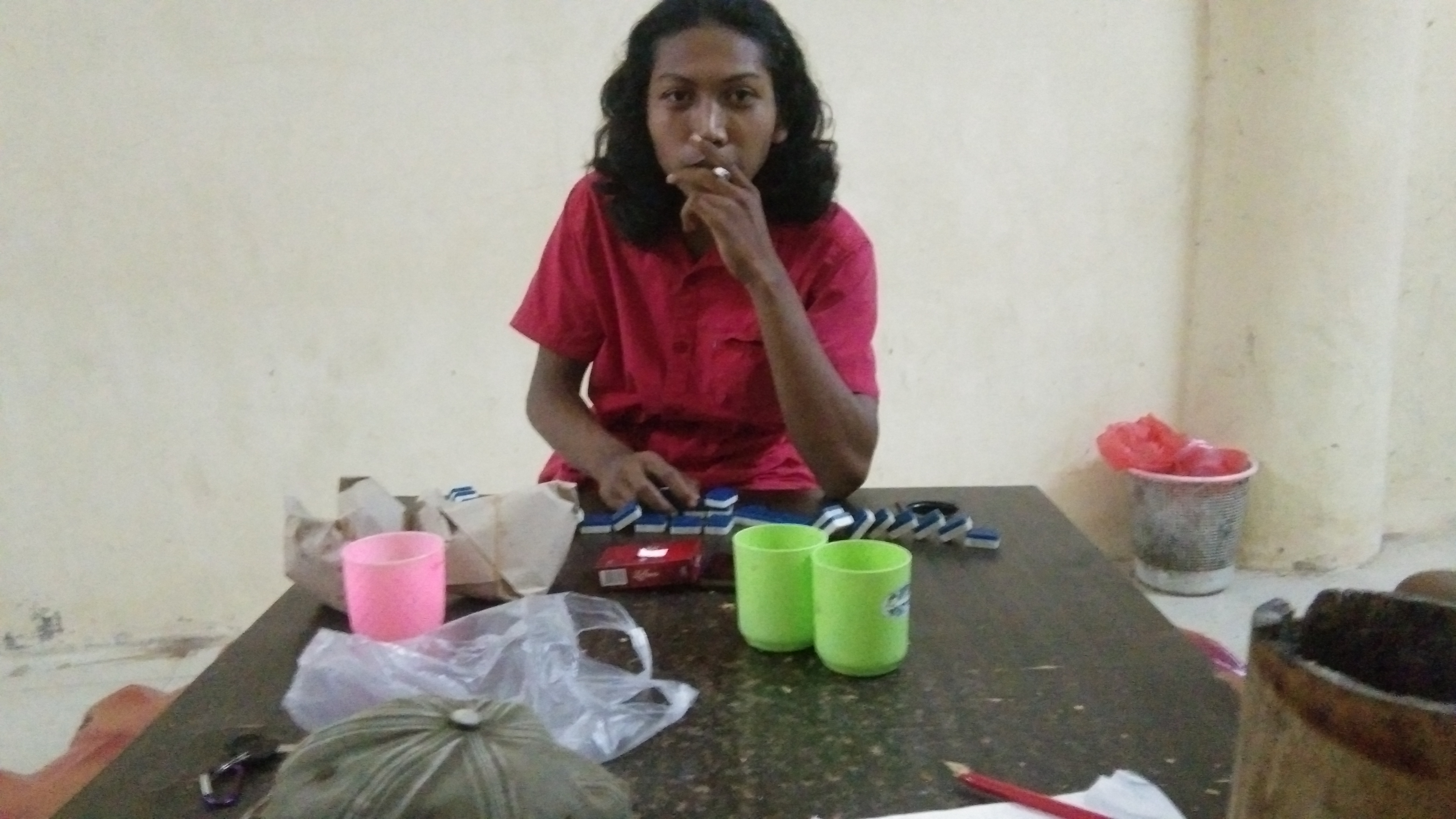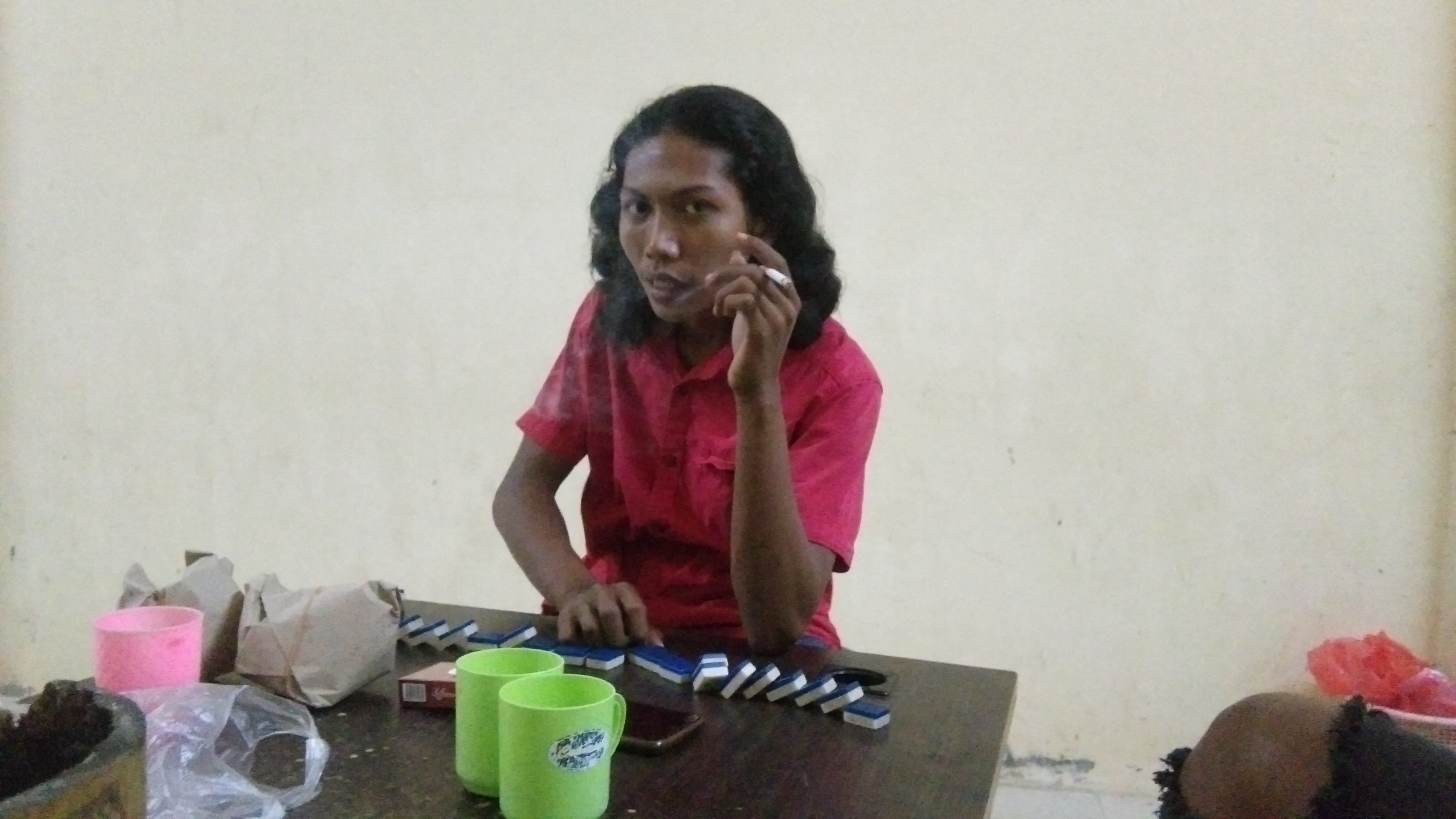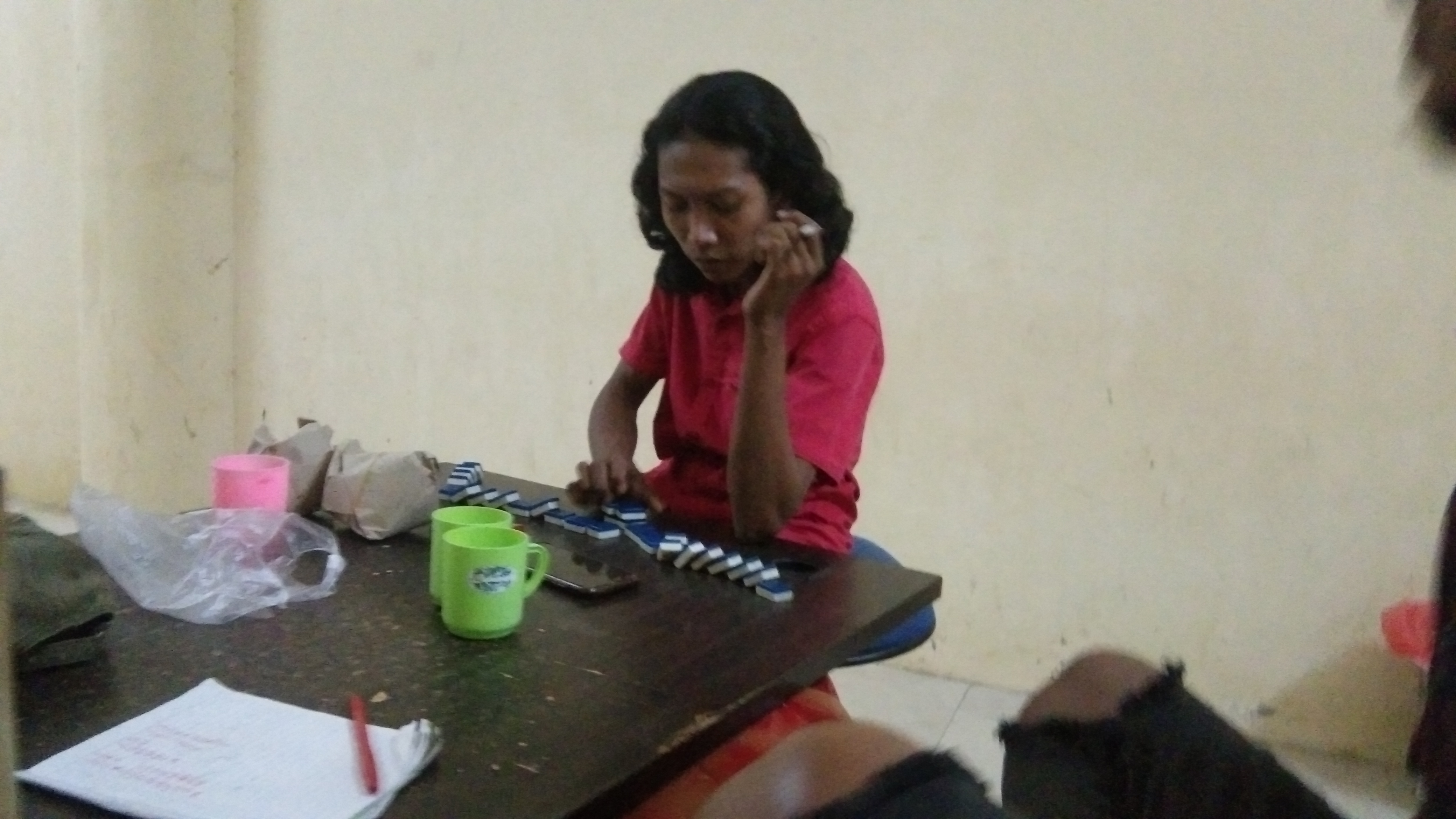On this quiet night, the four of us lived in the SME's secretariat and we felt very bored for us to have a game, namely dominoes, we were playing and laughing while playing the dominoes.