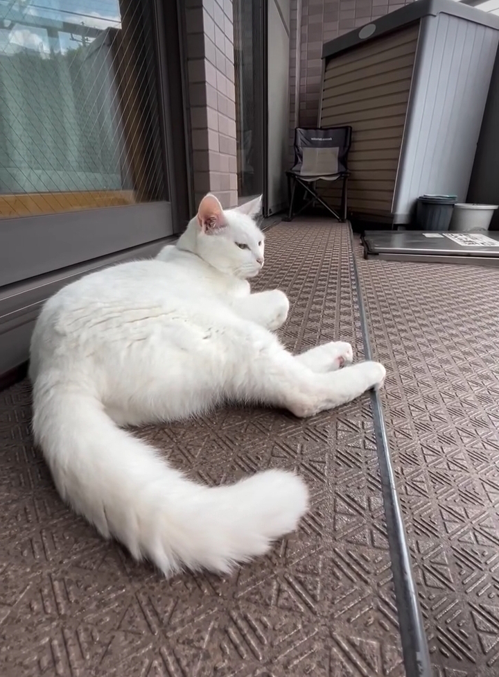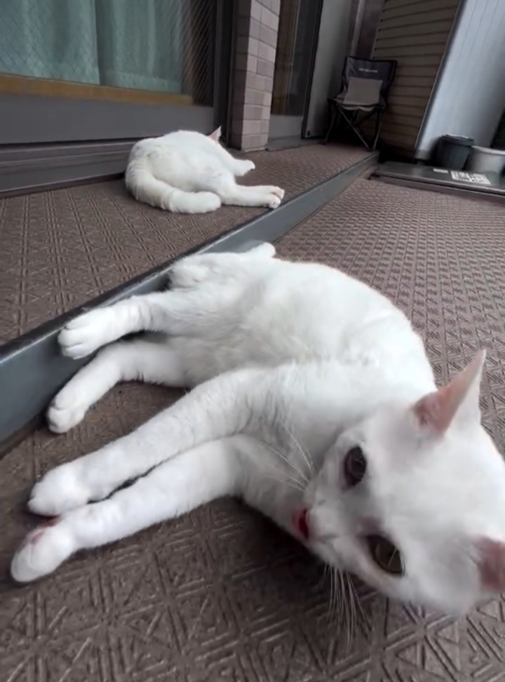 He felt comfortable and at home lying there, because no one disturbed him. But suddenly another white cat appeared and surprised the cat who was lying down relaxing earlier. The white cat continued to walk closer to the cat who was lying down relaxing.