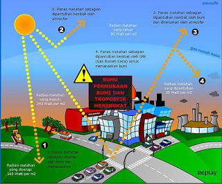 global warming is a process of increasing the average temperature of the atmosphere, the ocean, and the Earth's land, Symptoms of rising earth surface temperatures due to rising intensity of greenhouse effect. The issue of global warming arises because it has a huge impact on the world and life of living things, namely world climate change and sea level rise. The ozone layer is a layer in the atmosphere at an altitude of 19 - 48 km (12 - 30 miles) above the Earth's surface containing ozone molecules. The concentration of ozone in this layer reaches 10 ppm and is formed by the influence of the sun's ultraviolet rays on oxygen molecules.