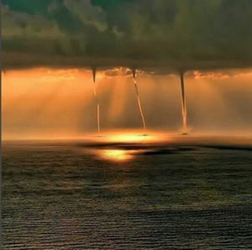 Is this a result of the increasingly strange Grand Solar Minimum weather conditions; waterspouts in the golden sunset off the Italian Coast. Three spouts coupled in this formation is an unusual vortex in the atmosphere.