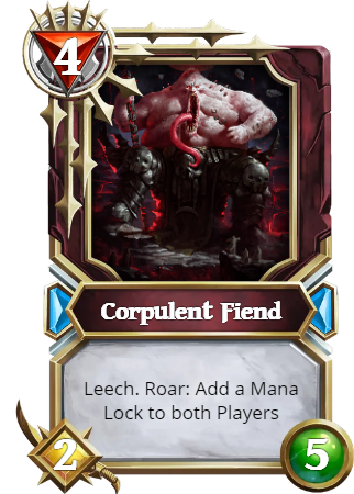 The Corpulent Fiend is a simple War card. It provides a decent-sized body with Leech at 4 mana and also a Mana Lock to help reign back the Control decks.