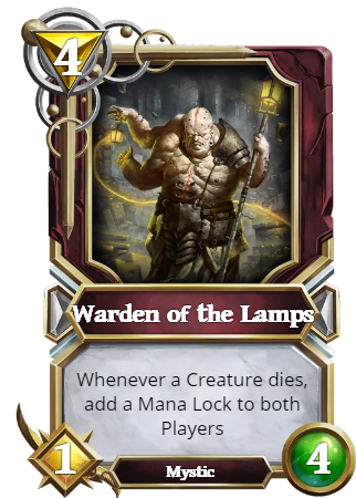 Warden of the Lamps is a solid backing for a Light Zoo deck. Until the opposing Player removes it from the board, it will keep the Control decks suppressed. Thought about making it Backline but I think that would be too much.