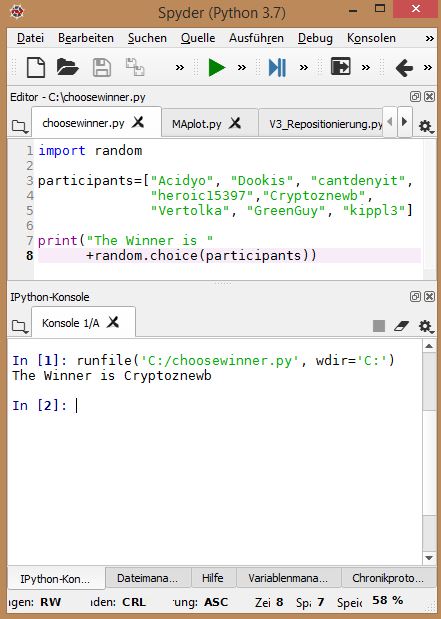 I chose the winner of the 2.5 STEEM randomly via python script:
