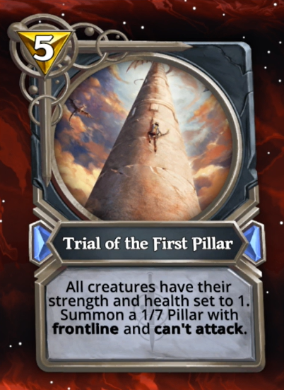 The card is amazing! Maybe a bit too good. Setting all creatures on the board to 1/1s is powerful as it is but as a bonus, you get a 1/7 Frontline creature that can't attack. Other than an obvious weakness for a spell, like creatures with Ward, this card doesn't have any downside no matter the opponent's board state. Versus Big boys, getting them to 1/1 is strong and versus wide boards with a lot of smaller creatures you also get that 1/7 Frontline that is enough to stop their entire board of 1/1s.