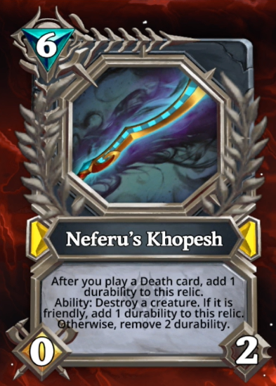 Next up we have a legendary relic card. This card definitely has the potential to give an insane amount of value but there also a lot of risk with it too. Being able to remove any creature each turn is an amazing ability for 6 mana but here's the problem. First, turn that it's played you just paid 6 mana for nothing really and if your opponent has relic hate cards and destroys it that will result in a huge tempo and value loss. On the other hand, if the relic wasn't answered and/or your opponent doesn't have anti-relic cards at their disposal they will quickly start falling behind. For this card to be worth it only thing you need to do is to play a single death card before using its effect so that you can activate it again.