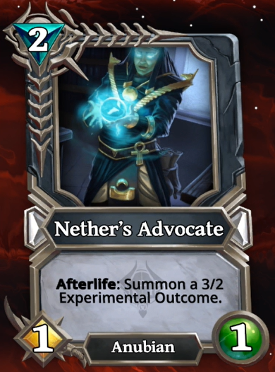Summoning this card from the void is done easier with god power Reanimate so this type of decks will also be including it. Canopic Hoarder and Sand Scorpion have multiple synergies with this card. Not only are they able to return this card from your void when you are below 15 but also they are 5-cost creatures so Reanimating them can bring her on the board in other situations. Being Anubian there are even more synergies like Sarcophagus. It is safe to say that this card will be viable and all over the Death deck archetypes and in some form or another a part of the meta.