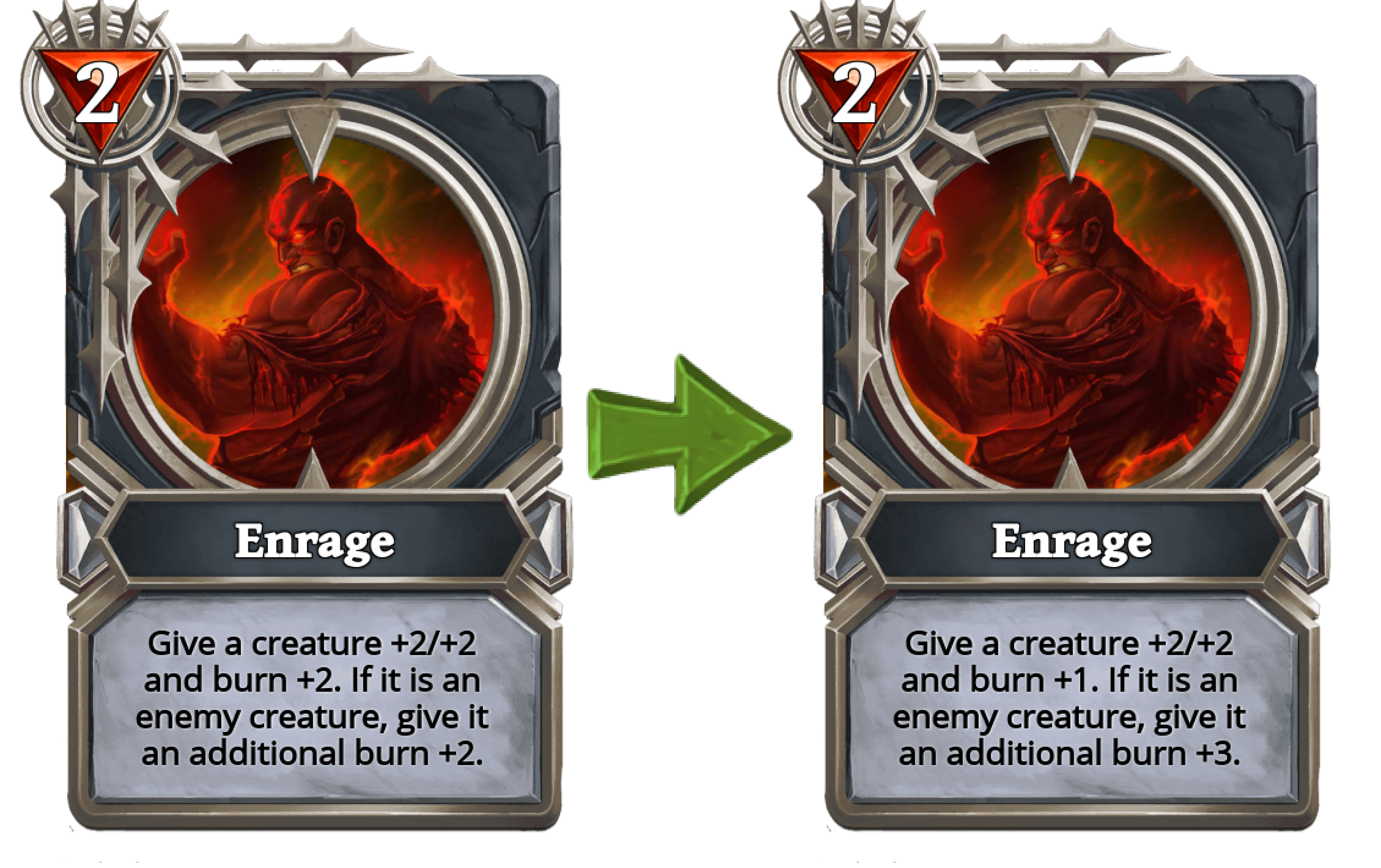 Enrage changed from "Give a creature +2/+2 and burn +2. If it is an enemy creature, give it an additional burn +2." to "Give a creature +2/+2 and burn +1. If it is an enemy creature, give it an additional burn +3".