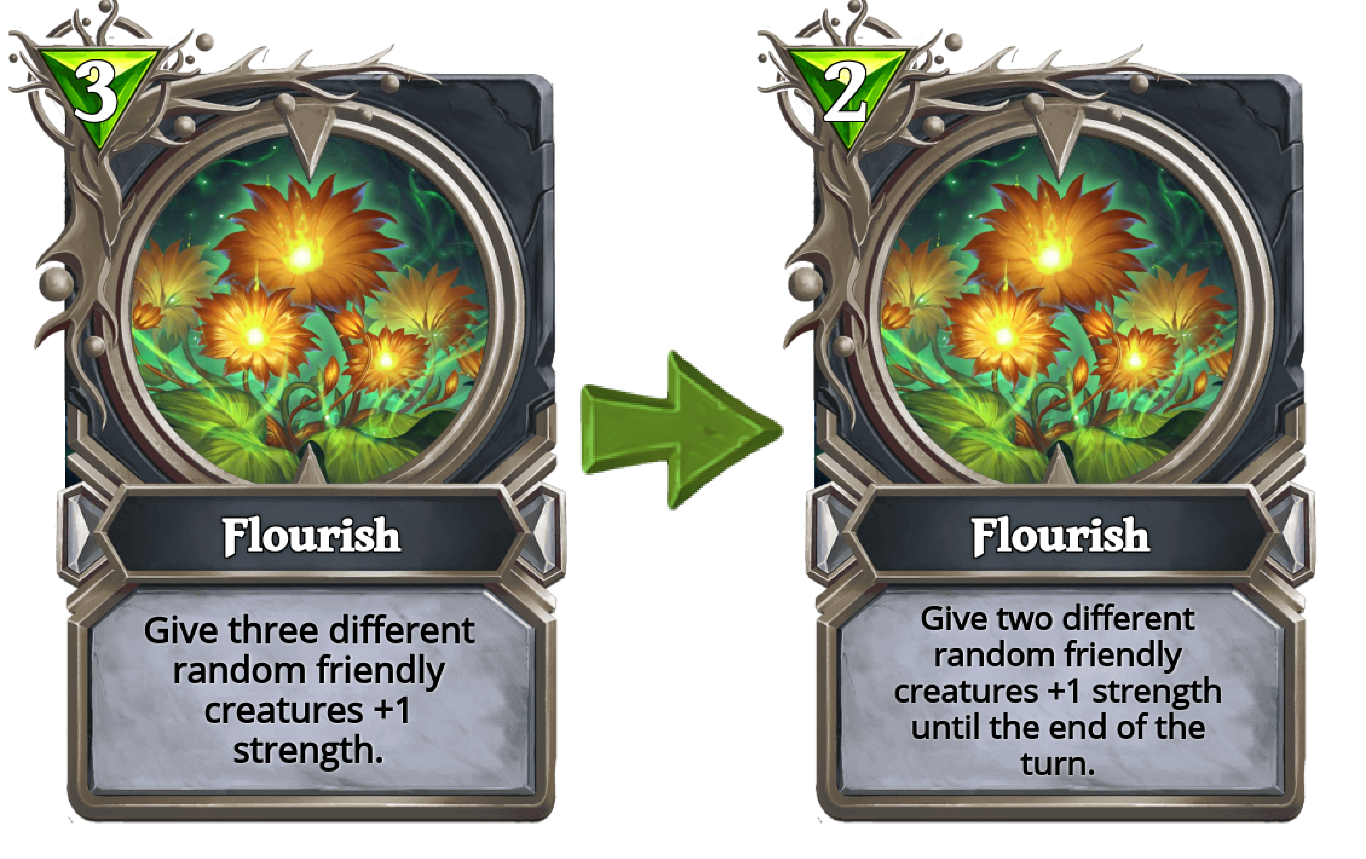 Flourish changed from 3 mana, "Give three different random friendly creatures +1 strength." to 2 mana, "Give two different random friendly creatures +1 strength until the end of the turn."