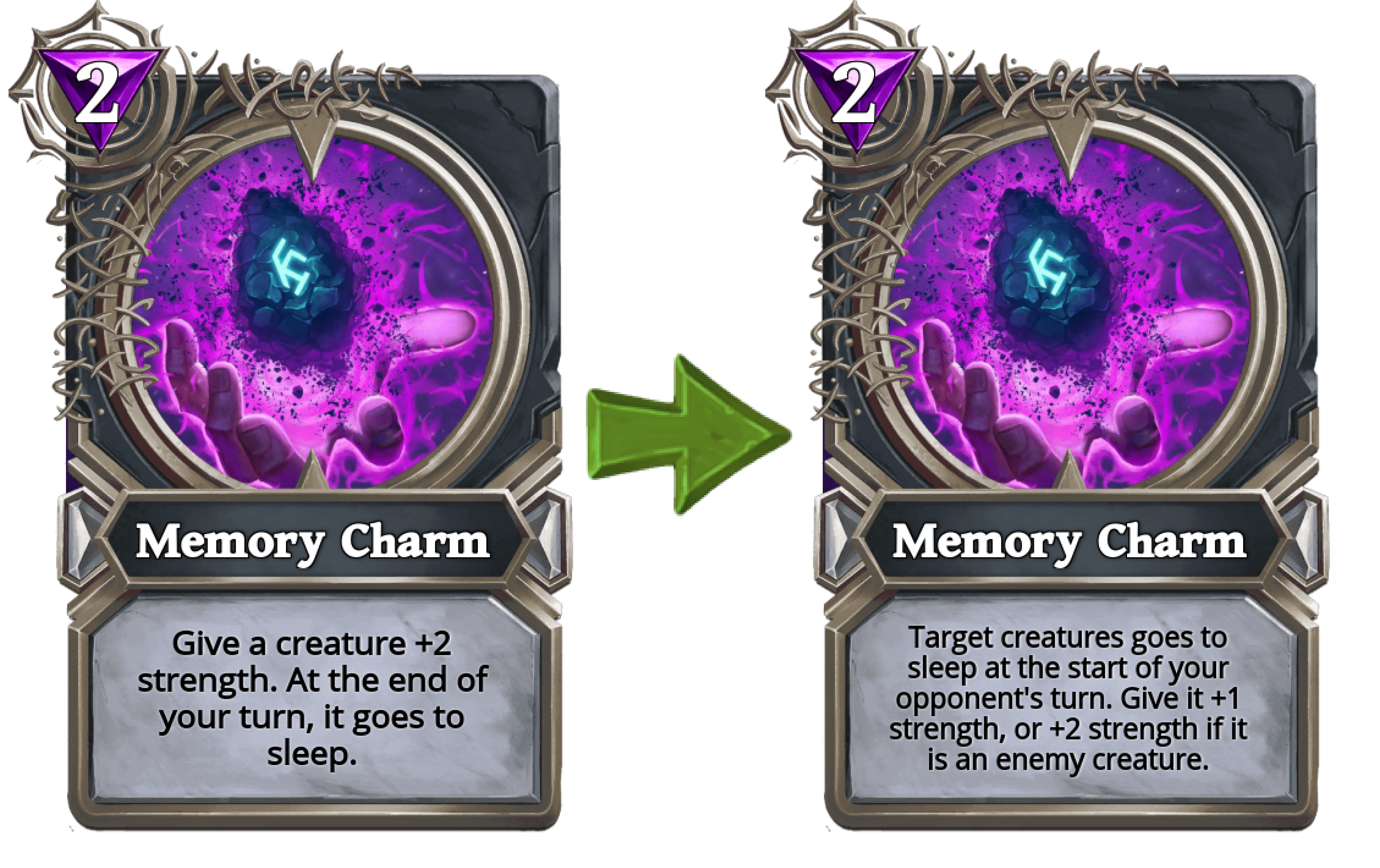 Memory Charm changed from "Give a creature +2 strength. At the end of your turn, it goes to sleep." to "Target creatures goes to sleep at the start of your opponents turn. Give it +1 strength, or +2 strength if it is an enemy creature."