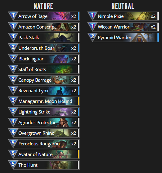 Hey guys, today we'll take a look at a variation of a midrange list for Nature. In a classic midrange style, there are no specific win-condition, usually overwhelming your opponent with mid-sized creatures does the trick. Because of this, lists like that can easily swap out the tech choices that can give advantage depending on the meta. The list we have today is geared towards beating decks like Rune Magic, slower Light decks, and Onslaught War which seem to be popular lately, and it does a good job versus Enrage decks as well, okay let's see it: