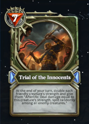 The last card on the list doesn't have anything synergistic with Olympians and it's a late-game War spell that is somewhat confusing to me as what its actual purpose is. Cards that cost 7 mana are usually taking up the whole turn to play for more than half of the game so they always need to do something impactful. That's why we see a lot of Demogorgons, Ashen Drakes, and similar cards that do something useful the turn they are played on in the 7 mana slot. This card, on the other hand, doesn't do anything meaningful for you immediately and also requires a setup and presence on the board and a higher strength creature. The requirement for this card to work stack up but the card doesn't give you much in return. Yes, buffing your creatures with this does force your opponent to remove them before further developing a board but since you kinda "lost" 7 mana a card while doing so they will still be able to reapply the pressure and start winning on the board regardless. I just feel like if you already have some board presence that further developing your board would be much more useful than spending your turn and a card to potentially reset the board even though it looks unlikely that it is going to happen.