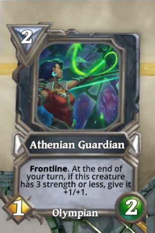 At first glance, this card screams OP to me. I mean, if we compare it to a Shield Maiden, a 2 mana 2/3 Frontline, this is the same card with an upside. Because the turn we play Athenian Guardian and pass a turn she will buff herself into a 2/3 but in the next two turns it will go up to a 4/5!! I don't get it why is this the case, but wait... there is more. I would assume that this card fits really well in Light decks so healing can enable her to survive more easily through many turns and buffing her health even more is starting to sound crazy. An interesting combo with her would be Reformation because it sets her strength back to 1 and gives 1 health so that she can continue ramping up. I can't imagine this card getting reworked a bit, maybe costing 3 mana with 1 more health or something like that.