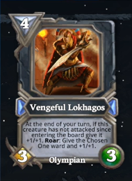 This one looks interesting. Basically a 4 mana 4/4 with a Roar that buffs the Chosen One. The ongoing effect incentivizes patients but still, it's an okay card even if you don't wait for a single turn to attack so I think it might be a powerful one also. Because of the Chosen One mechanic, I would assume this is a Light card even though it looks like a neutral. Vengeful Lokhagos doesn't require synergy to be good so we might see it played a lot in Light decks but having that Olympian tag gives her a bit of additional power in potential future Olympian decks that we can clearly see cooking up with all new Olympians getting introduced. It will most certainly see play outside of the Chosen One archetype because this mechanic work even without that God Power and buffing something in your deck with Ward and +1/+1 is always a good thing.