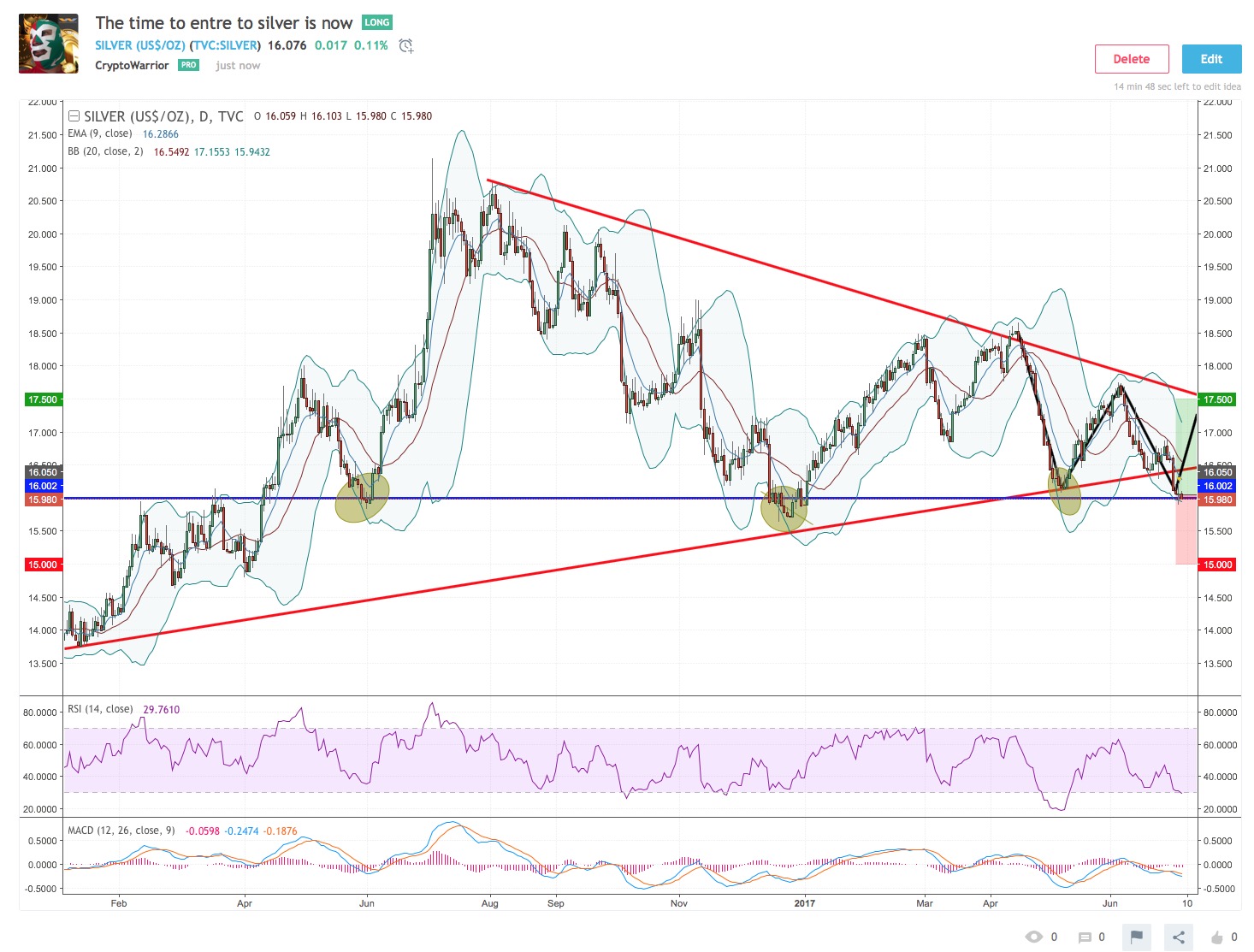 I love this chart, really, I think I will go up. Silver is at its low price for more than a year, and it is respecting it support, for that long touching it in three times on the past, now it touched for the four time, a nice W pattern RSI below 40%, really nice. My move: I enter at 16.05 Stop loss: 15.5 Target price: 18 expected profit: 13%