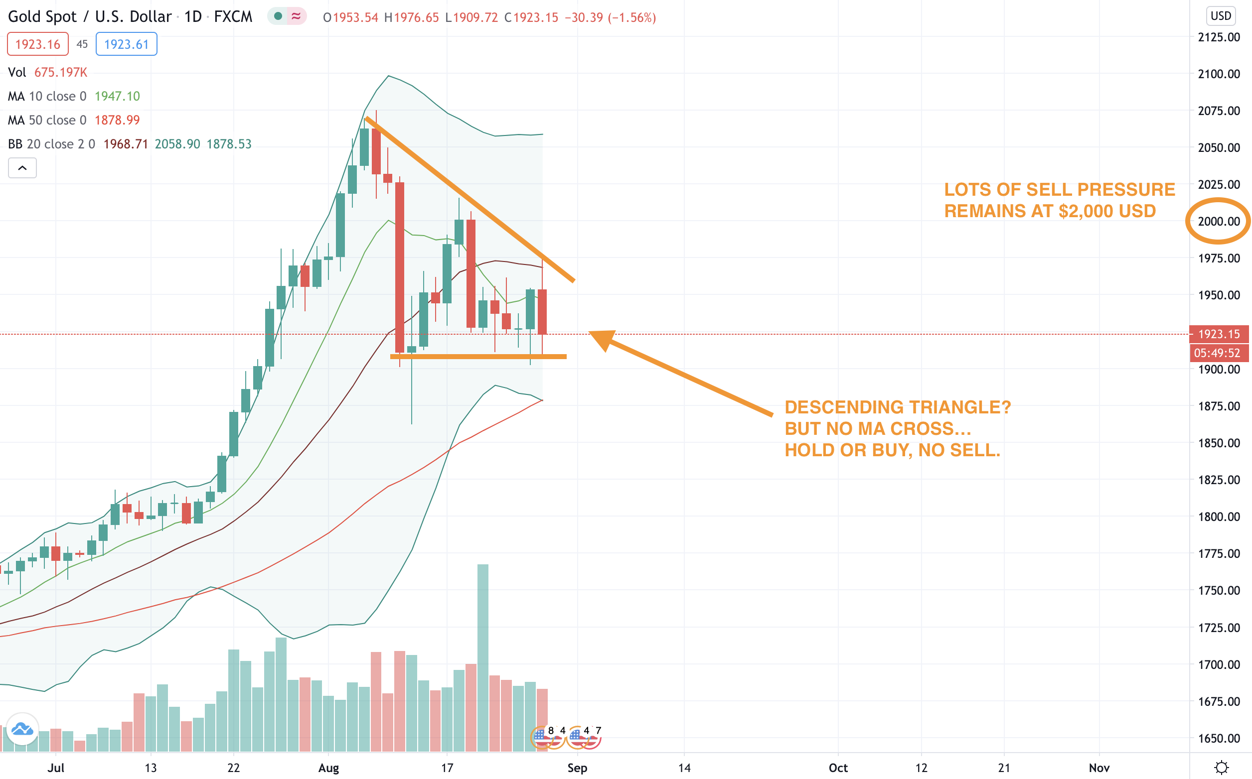 For now, we would hold what you have and not sell yet... Buying could be an option if the descending triangle plays out and the price drops. Things could change quickly though, gold could still breakaway and move up. The only problem it has is there is a lot of sell pressure at $2,000.