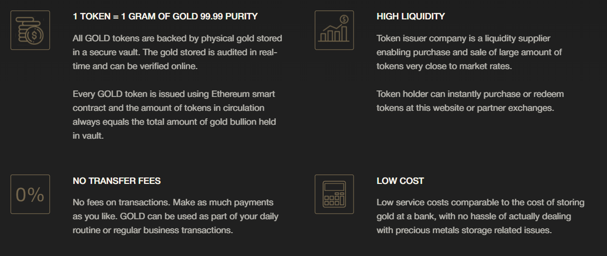 1 Gold token could be used to purchase 1 gram of 99.99% of Gold. That means that Gold token is considered a stablecoin, as its worth is proportional to the real gold itself.