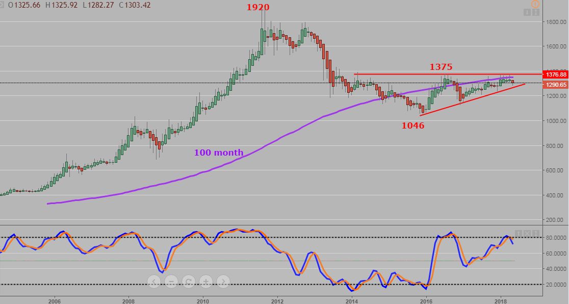The monthly chart of Gold shows the peak at 1920 back in 2011, the decline and the potential bottom in late 2015.
