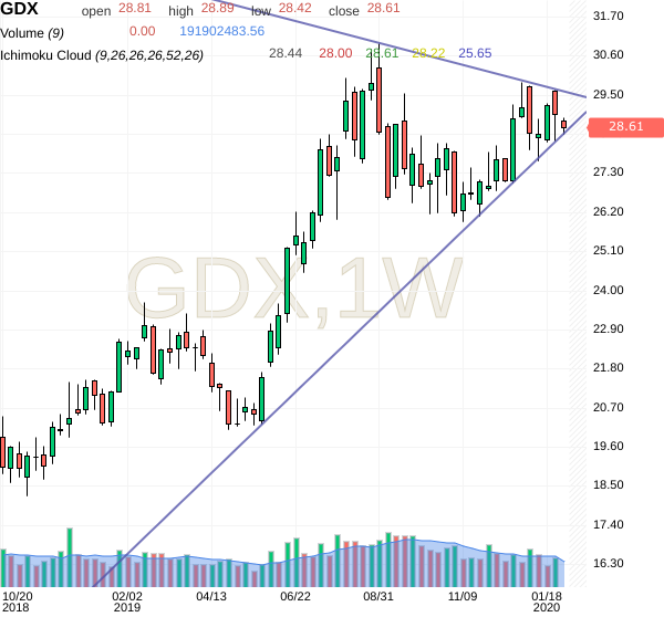 The last chart is the weekly view of GDX and the triangle formation forming on the daily/weekly charts. It seems the short-cartel have managed to manipulate silver and GDX to prevent the breakout. This has forced the majority of retail traders to close out their longs.