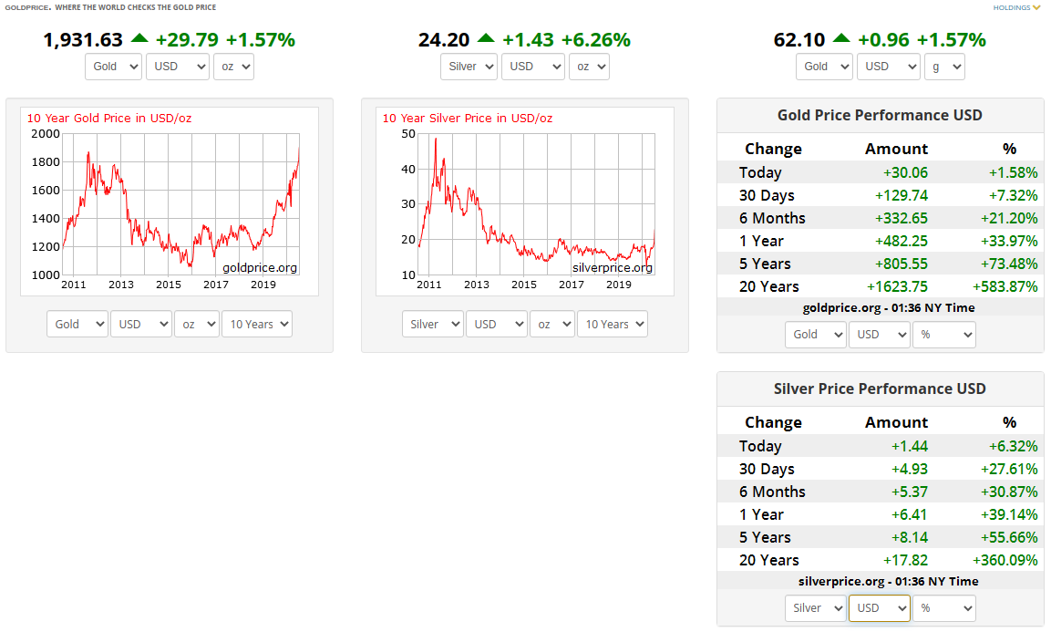 • Gold has surpassed previous high of $1920 USD in 2011 (the best chart I could find has the price at $1883 on 29th August 2011). Started 2020 at $1510!