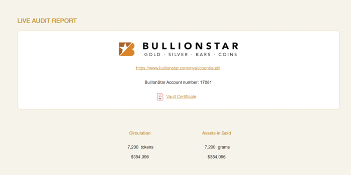 Liquidity is ensured at all times, granted that independent live audits can be verified to cross-check the number of tokens in circulation, with the amount of vault-stored gold. The value of gold bullion can be verified in real-time with BullionStar’s Live Audit Reports.