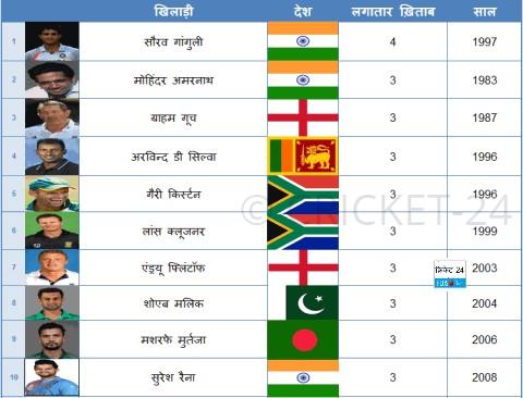 अमरनाथ ने विश्वकप-1983 के सेमीफाईनल, फाईनल और फिर पाकिस्तान के खिलाफ एक वनडे मैच में लगातार 3 ख़िताब जीते थे। सुरेश रैना ने एशिया कप-2008 के लगातार 3 वनडे मैचों में 101,84 और 116 रन की पारियां खेली थीं, जिसकी वजह से उन्हें ये ख़िताब मिले।