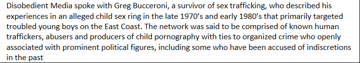 Disobedient Media spoke with Greg Bucceroni, a survivor of sex trafficking, who described his experiences in an alleged child sex ring in the late 1970’s and early 1980’s that primarily targeted troubled young boys on the East Coast.