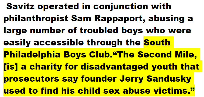 Savitz operated in conjunction with philanthropist Sam Rappaport, abusing a large number of troubled boys who were easily accessible through the South Philadelphia Boys Club.“The Second Mile, [is] a charity for disadvantaged youth that prosecutors say founder Jerry Sandusky used to find his child sex abuse victims.”