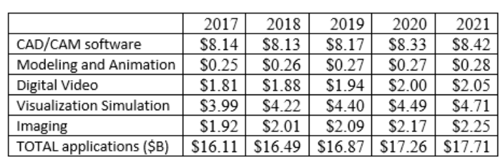JPR says the market for CG software in 2017 was worth $16.1 billion (not counting services, maintenance and other aspects) and is expected to grow to $17.7 billion by 2021. The leading graphics-based software products in visual content creation and computer-aided design are moving their sales model away from up-front license purchase and to subscriptions, along with adding cloud-based services.