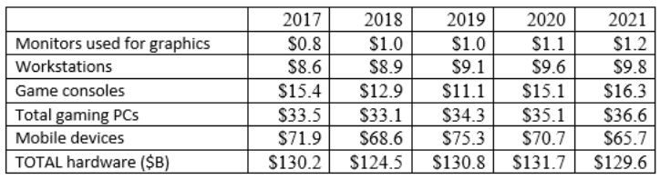 According to CG market research firm Jon Peddie Research (JPR), the computer graphics hardware market was worth $130.2 billion in 2017 and is expected to drop slightly to $129.6 billion by 2021, as refresh cycles in workstations have slowed and the use of Graphics Processing Units (GPUs) for cryptocurrency mining becomes a smaller part of the overall market.