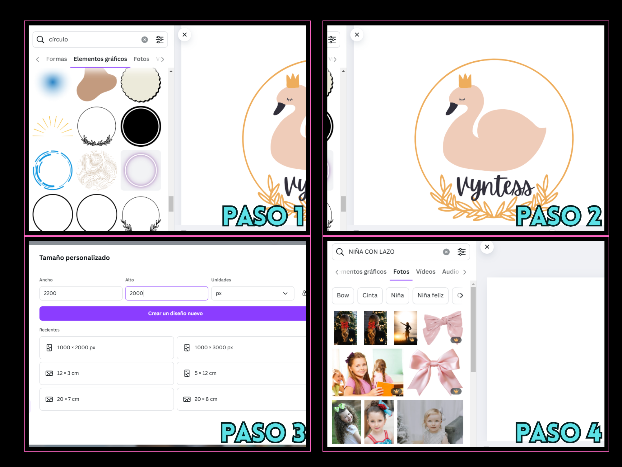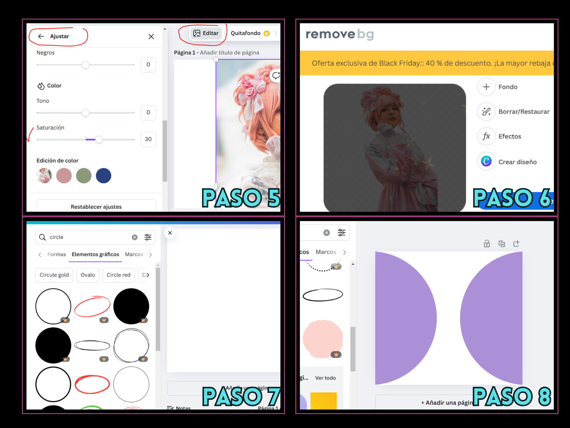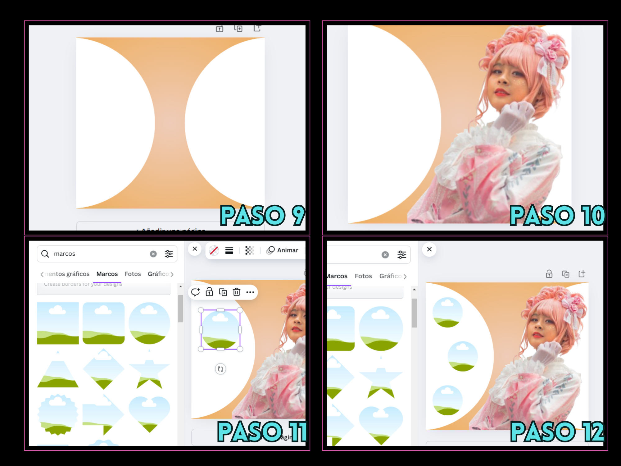 Paso 11 y 12: En este punto hice una búsqueda de "marcos" insertando un modelo circular y después de colocar el tamaño deseado, dupliqué las formas para que fueran 3.