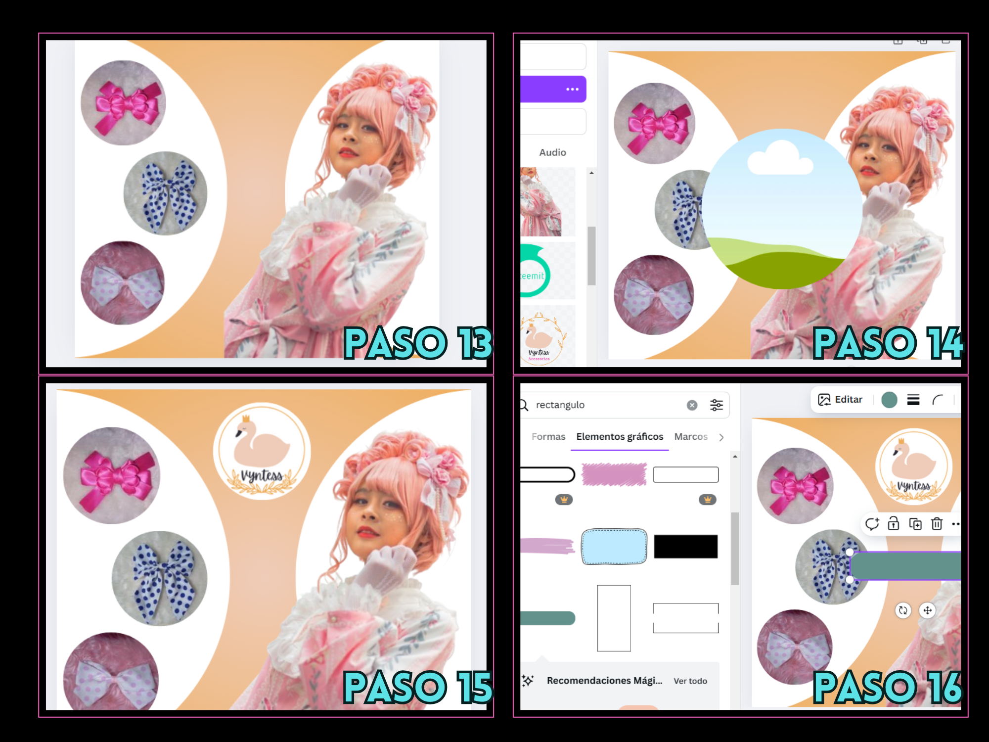 Paso 13, 14 y 15: Inserté algunas imágenes de los accesorios que son confeccionados por vyntess (imágenes reales). Seguidamente, haciendo uso de otro marco circular inserté el logo de la empresa.