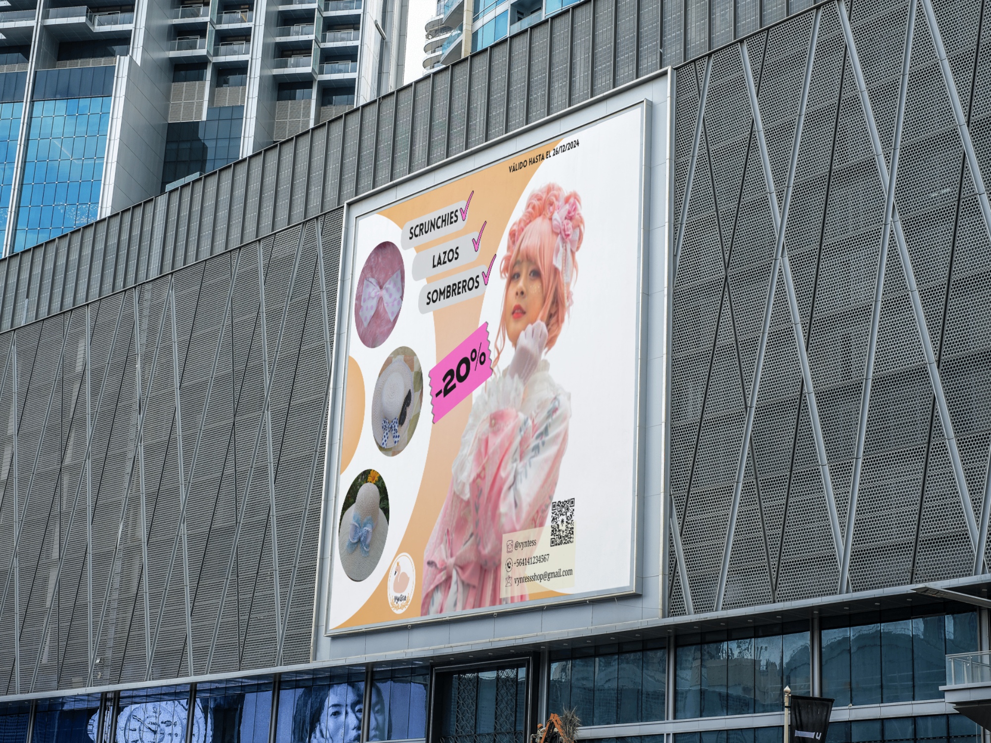 Paso 18 y 19: Agregué un "elemento gráfico" para denotar un descuento del 20% y lo coloqué en color rosado un poco estridente ya que pensé que debe ser llamativo en este punto. De igual forma agregué un código QR informativo de la empresa.