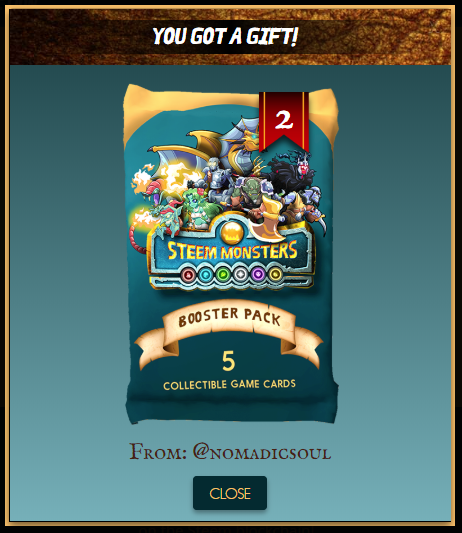 I participated in a contest involving MENE and Steemmonsters, where the grand prize was 10 Steem Monster Booster Packs. My name wasn't drawn the first time, but in a surprise move, there was a second drawing for two more packs... and I won! She sent me two Steem Monster Booster Packs!