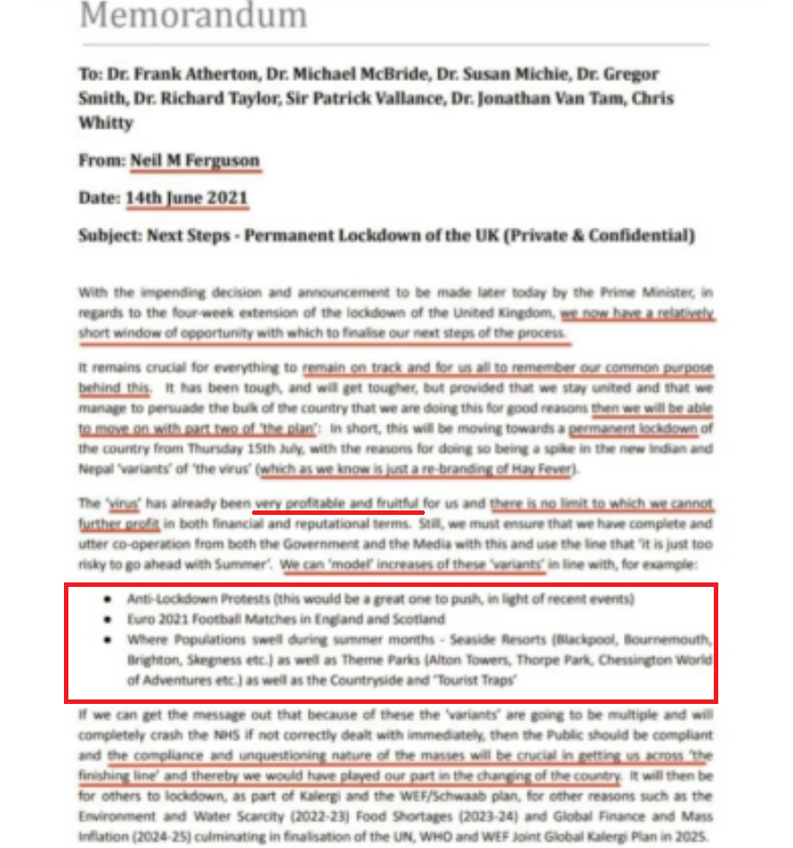 In case the video becomes no longer available by the time you read this, basically it talks about a supposed document detailing a plan to put the UK in lockdown permanently by mid July. It details how they will use the current "pandemic" to manufacture more fear inducing stories of new "variants" of the so called virus and use this to go in lock down permanently. This could easily be fake news to further discredit those trying to get the truth out but I think its best to look into it and decide for yourself.