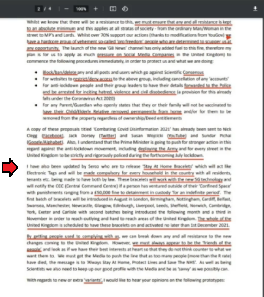 Here is another screen shot from the doc in the video, sorry they are a bit blurry but they mention: Using an indian "variant" as a justification for this, stopping of medicines at pharmacies to make people take the covid vaccines instead, making all people wear 'stay in' bracelets by the end of the year and a letter sent to the owners of facebook, twitter and youtube to censor any mention of this.