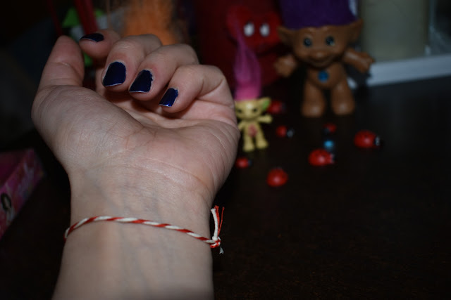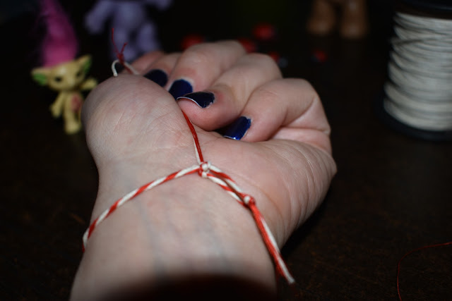 Every year on 1st March my grandma or my mum would make my sister and me bracelets with red and white thread. We were supposed to wear them for the whole month so we wouldn't get... burnt by the sun. Yes, you heard it right, we don't need sunblocks because we have our Μάρτη (martie) bracelets to protect our skin from the spring sun (a method scientifically approved and accepted by all dermatologists). You can also wear it as a ring (although I prefer the bracelets). At the end of the month, you cut it off and leave it on a rose or any other tree so that the swallows will take them to build their nests.