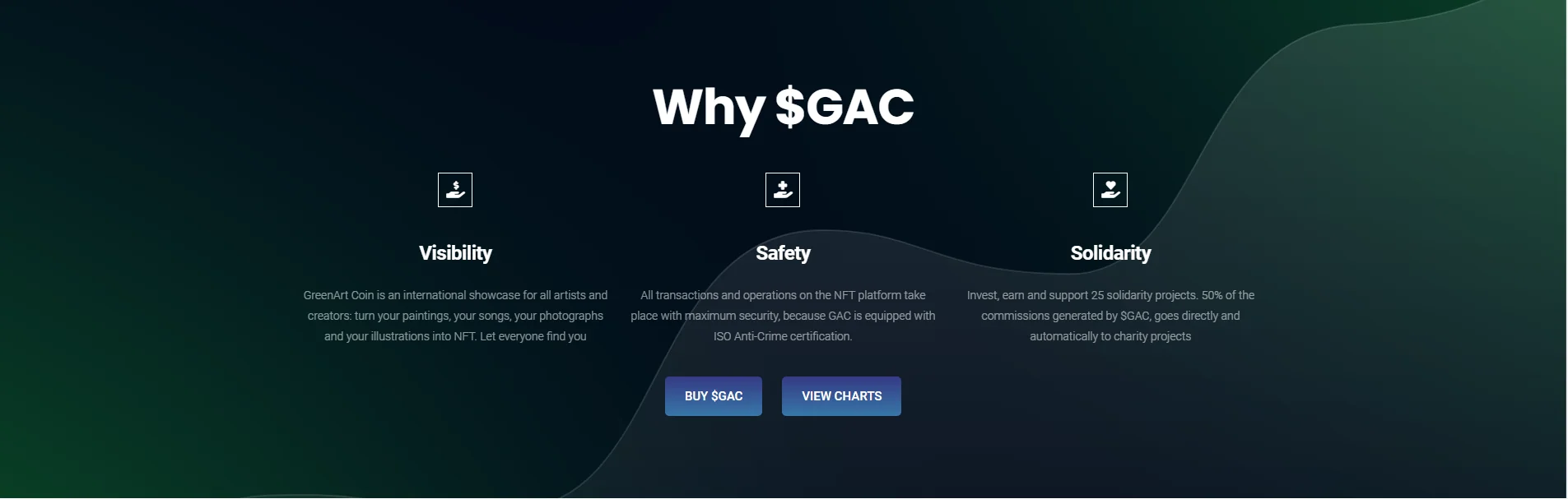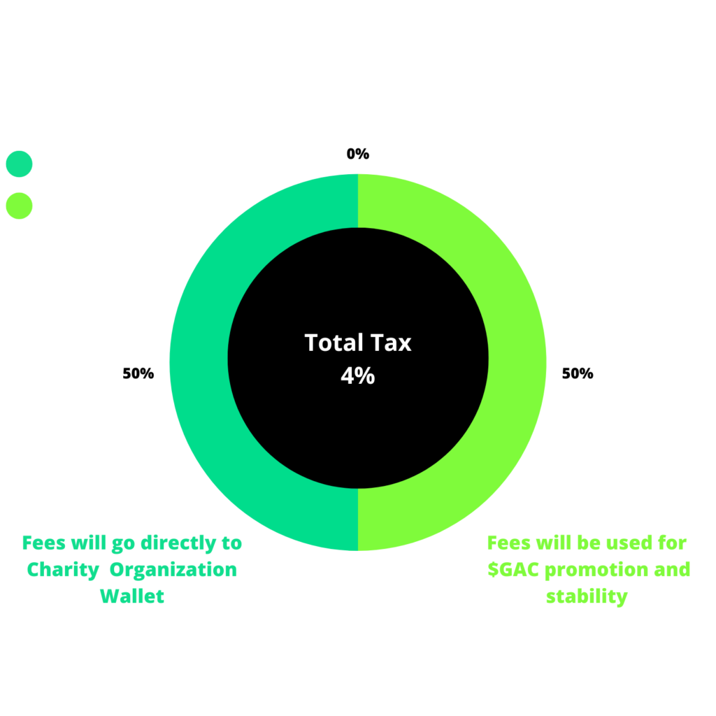 Solidarity : Invest, earn and support 25 solidarity projects. 50% of the commissions generated by $GAC, goes directly and automatically to charity projects