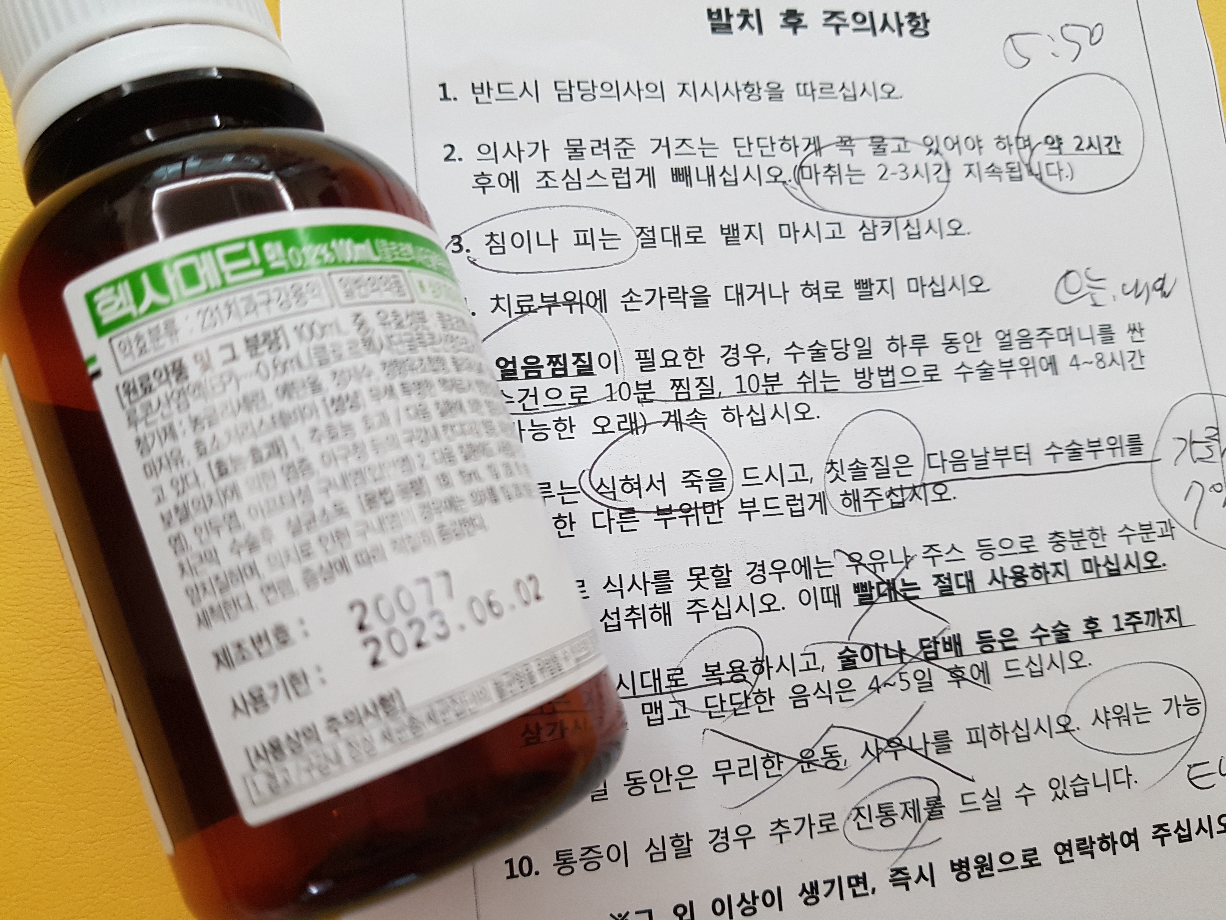 물론 마취가 풀릴 때쯤부터 통증이 밀려오기 시작해 헥사메딘 저 악마같은 약으로 가글하기 전까지는 참을만 하다 결국 타이레놀을 추가로 먹긴 했지만 생각보단 괜찮았습니다.