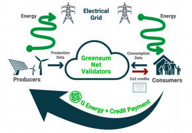 Energy trade on Greeneum doesn't only occur on Greeneum's ecosystem, but also on the electrical grid. E-data goes through validating steps where data is profiled and validated. Estimation of energy creation and use are normally run on the grid, and it gives users an opportunity to bond with one another in real time. Makers of the Greeneum platform are compensated with both the platform's token and the GREEN certificates. Users make use of GREEN certificates for daily consumption of energy. What they mainly do is to gather this greeneum CO credits for their part they take in consuming the energy.