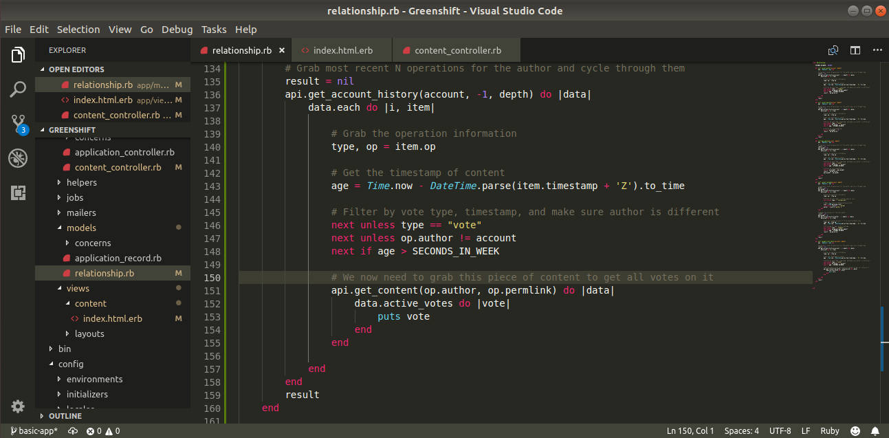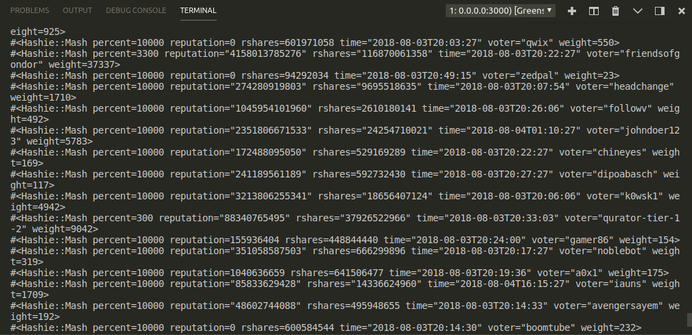 In our second query to the blockchain, we receive a ton of information. For now, we will verify that we are getting votes for a specific piece of content and then cycle through the votes to see what information is given to us. Since this information is given to us in Hashies rather than JSON or regular ruby hashes, we can simply call fields using the dot notation. This allows the clean code we see above.