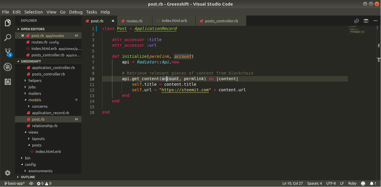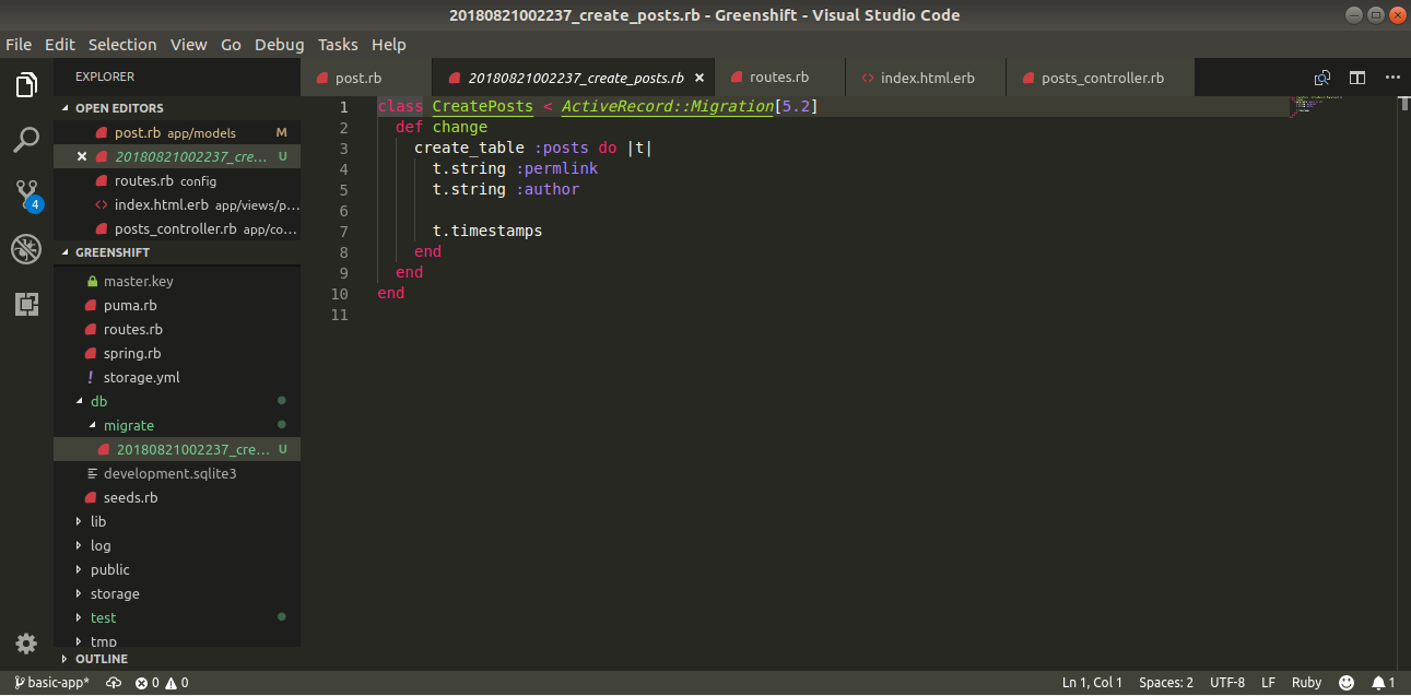 As you can see here, we tell the generator to give us a model named Posts with the fields permlink and author, which we will use as references to different pieces of content. The generator usually will create a new migration and a new model. Since we already had a Posts class already in our models folder, we simply modify our old one by deriving the ApplicationRecord class which new models use: