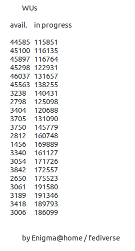 RE: Enigma@home has less WUs -> reason: message from 1941 decrypted -> cleaning up not needed WU batches + preparing new WUs