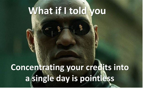 In the second step I have assumed R_total does not depend on i. Under these circumstances, then, it indeed doesn't matter how you distribute your credits. There is one rather obvious caveat, however: R_total does depend on i: